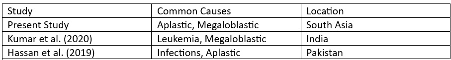 The distribution of causes observed in our study closely matches the findings reported by Kumar et al. (2020) and Hassan et al. (2019), though regional differences are evident. While Kumar et al. reported leukemia as the leading cause in Northern India, aplastic anemia was predominant in our study [11-12].